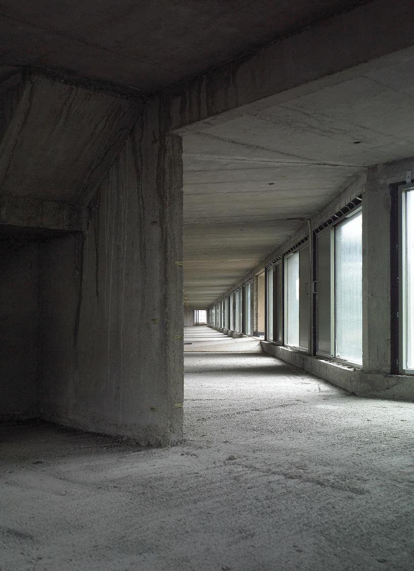 The streets in the sky have been altered as well, although not radically. As Moss puts it: ‘the analogy of the street in the sky is lost somewhat, it’s not like a proper street.’ Indeed, the ceiling is only 2.3m high, from finished floor to soffit. The New Brutalists took Le Corbusier’s rue intérieure and tried to make it less cramped and crowded by running along the perimeter of the building. But the ‘rue extérieure’, certainly the ones at Park Hill, suffered the same problem as the rue interieure. Lynn, identified the way Corbusian modernism created an ‘indoor no man’s land’ but he was not fully successful in dealing with it.