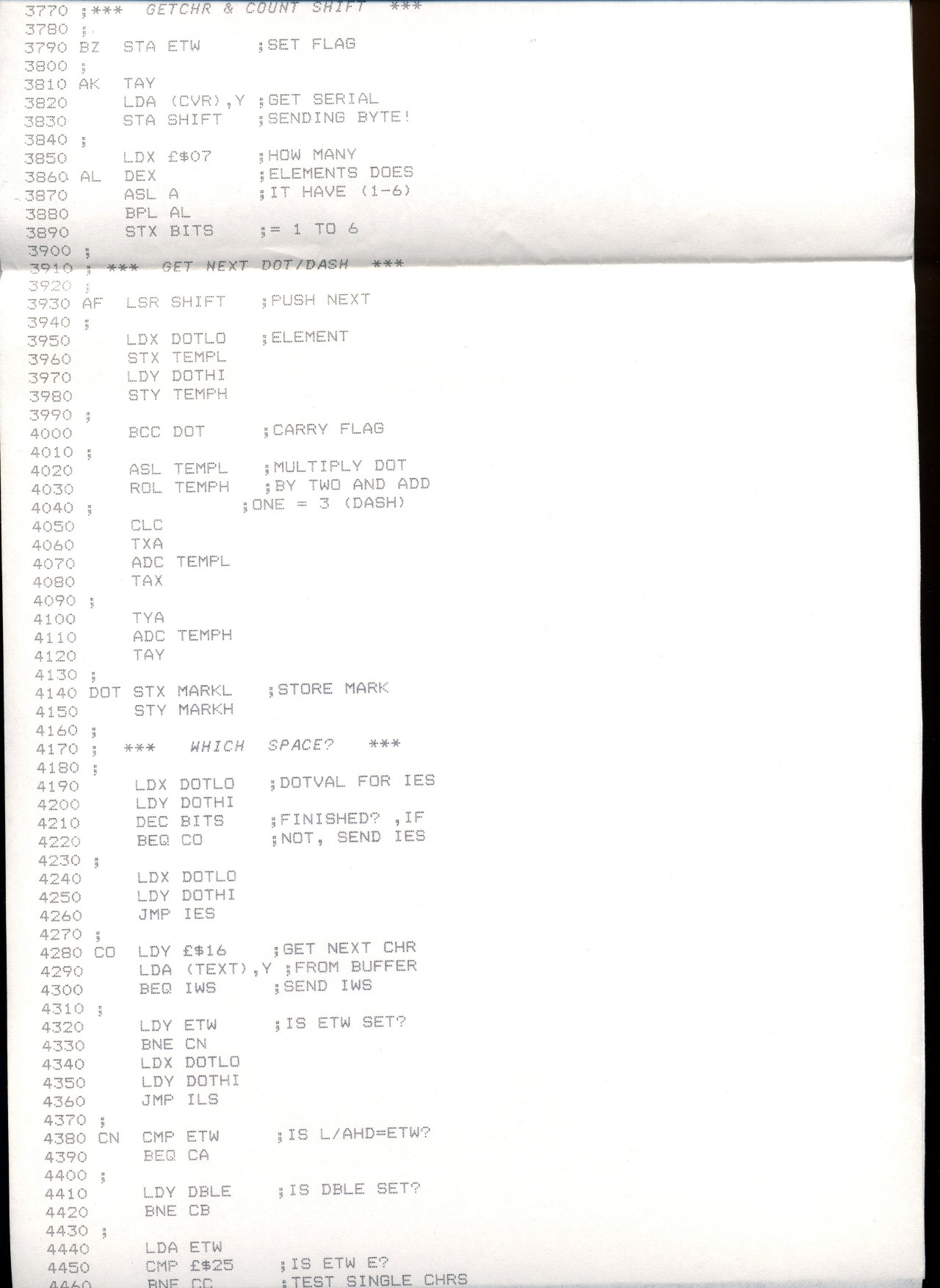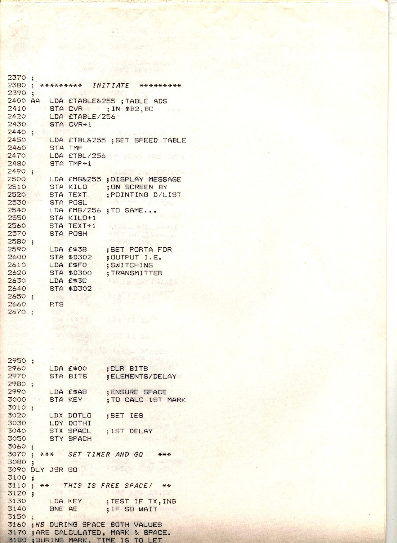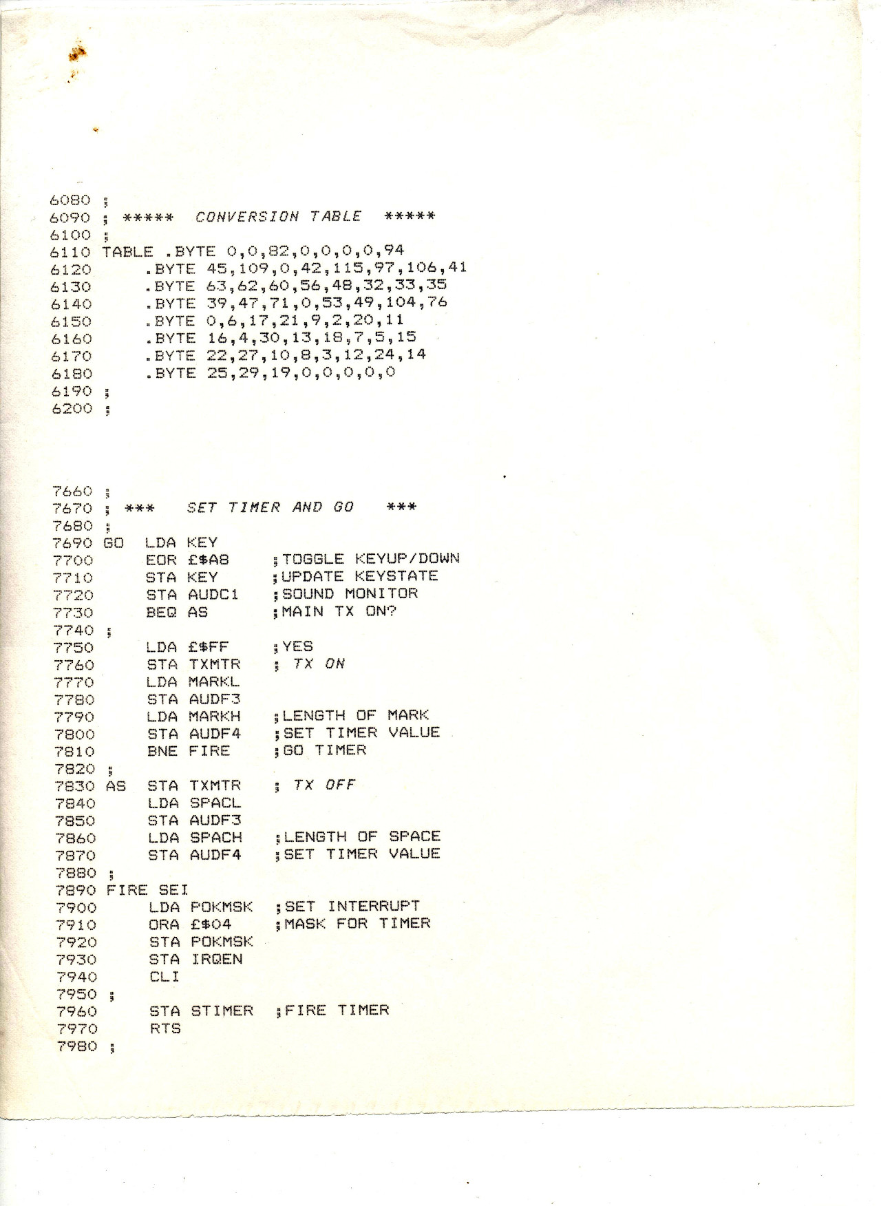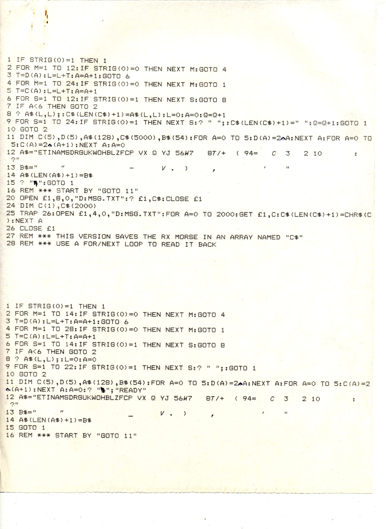 MorseRx.jpg Program1.jpg Program2.jpg Program3.jpg Program4.jpg Program5.jpg Program6.jpg Timing ch07.pdf MorseRx is the two versions of the receiving programme I wrote first. Timing is a chapter from a book on programming delays in modern computers. The Atari 800xl sent morse fine as it was because the clock was only running at 1.79Mhz. These days they run at Ghz. The remaining Program scripts are excerpts from the original (now lost) complete Morse Magic programme. One day I hope to rewrite it in full. More here Interrupt handling. I would set the Int' timer going for the duration of the dot, dash, or space and do the calculating in the meantime. Then when the interrupt returned it toggled the transmitter ready for the next duration be it mark or space. That became the basis of the running programme to send morse. |